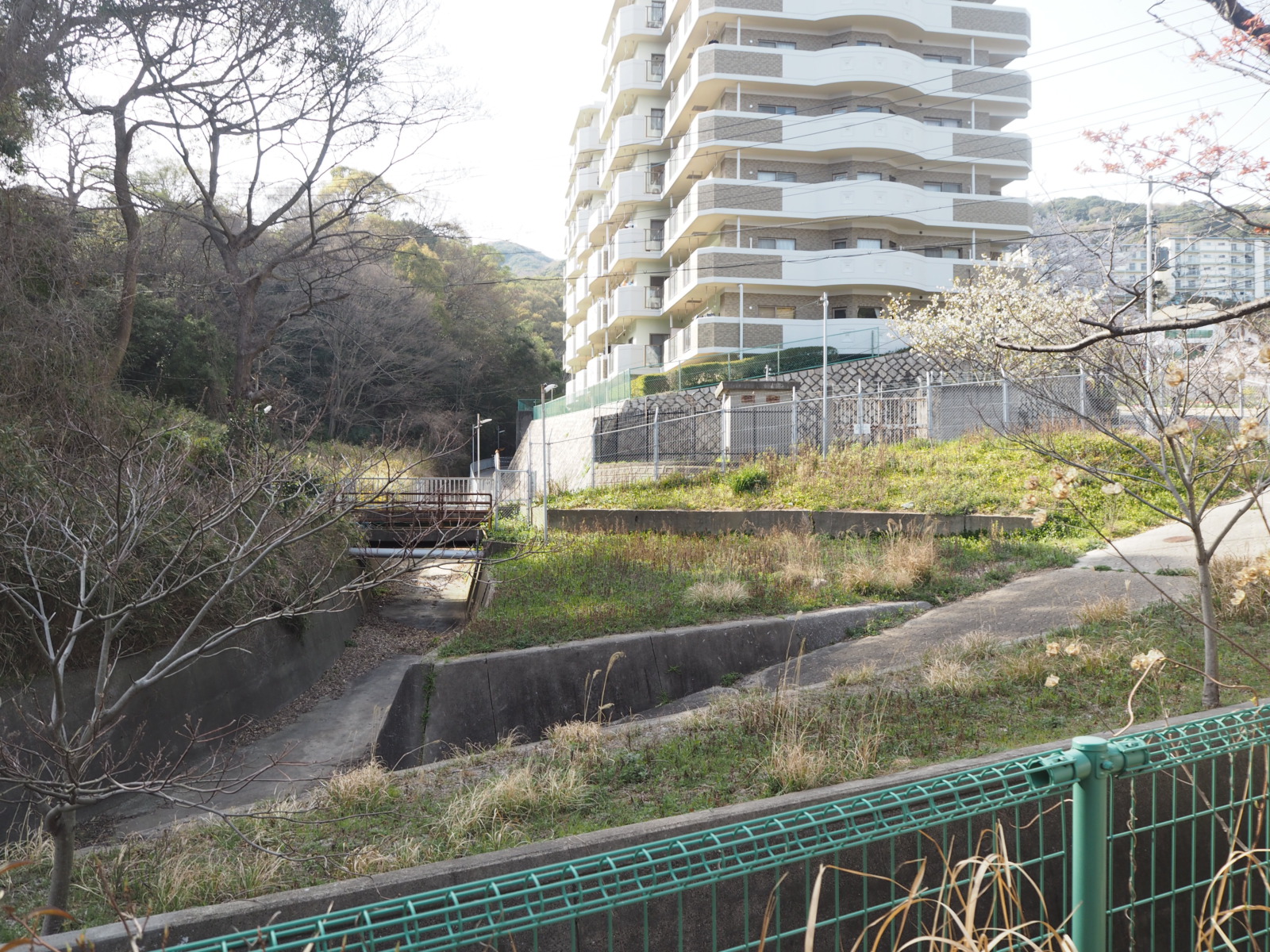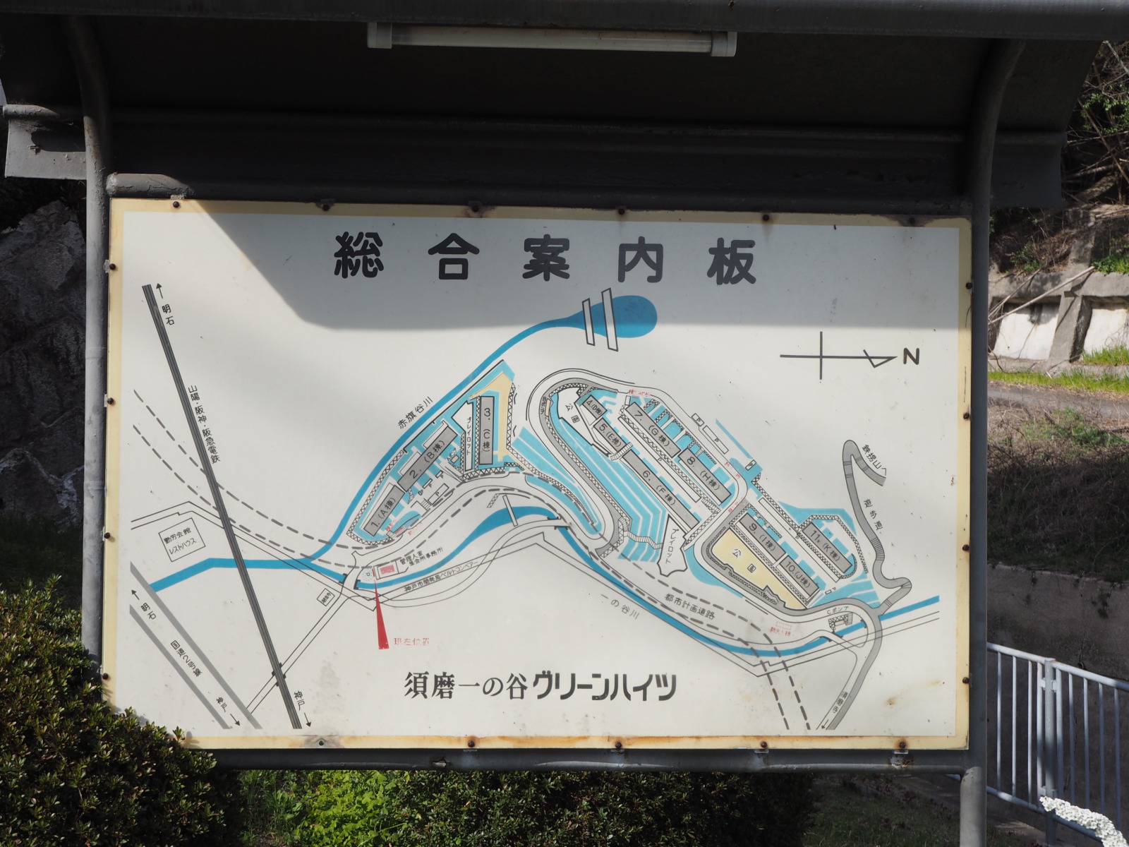 谷を抜けると「須磨一の谷グリーンハイツ」という団地に着きます。都市計画道路や「山、海へ行く。」の象徴・神戸市開発局の「ベルトコンベアー」の文字が見えます。流石にベルトコンベアーの痕跡はほとんど残っていないようですが。