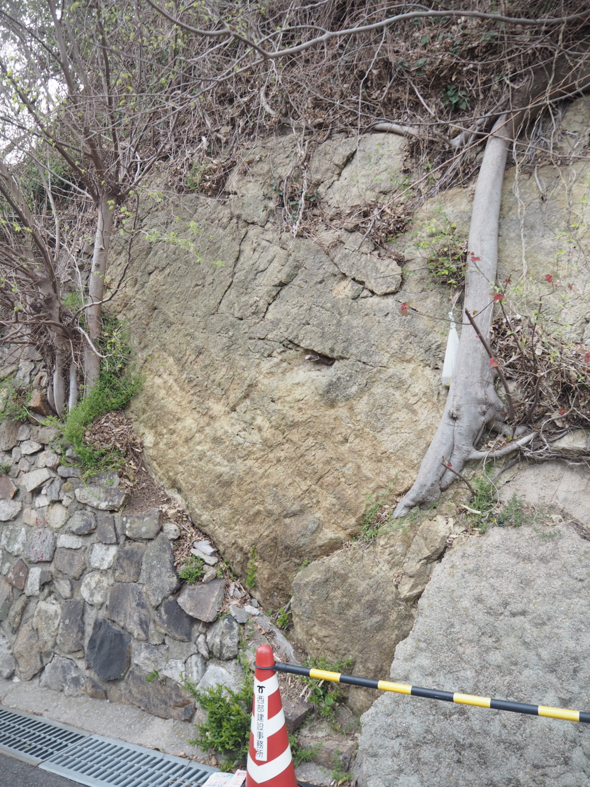 本日のハイライト、神戸丸山衝上断層です。六甲山が隆起したことが分かる逆断層だとかなんとか、で国の天然記念物に指定されています。しかし目立たないところにありますね…