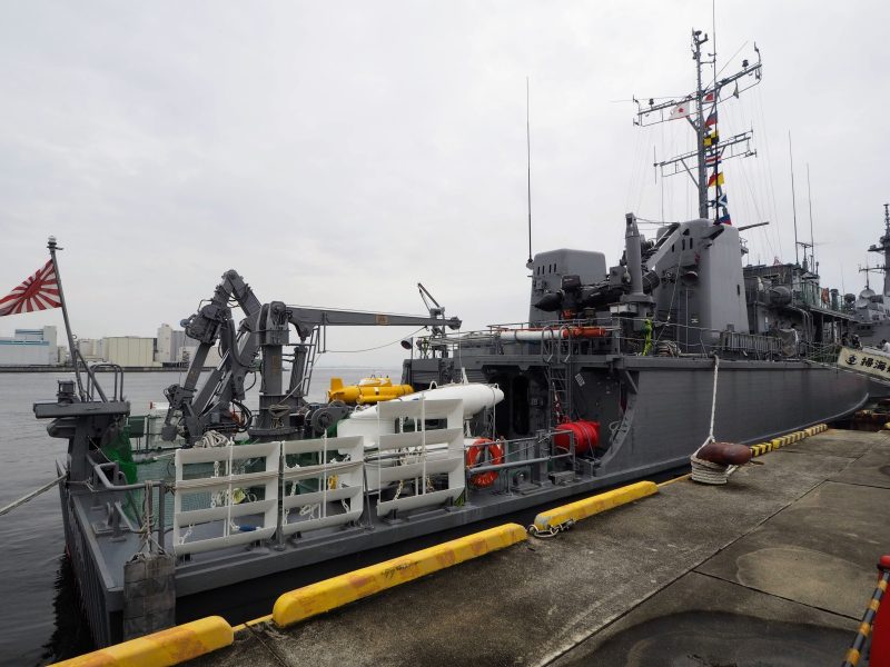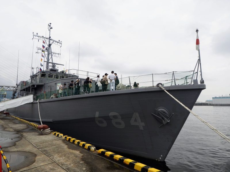 機雷を処理する掃海艇「なおしま」には乗艦できました。2001年に就役し、来年には除籍予定とのことで、もう見学できる機会は少なそう。掃海艇なので木造ですね。