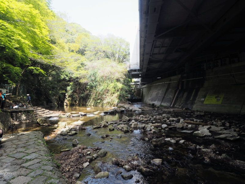 まずは新神戸駅のガード下にある河川広場を訪れました。ここは、左手から続く生田川(上流部は普通河川、下流部は2級河川)と、正面から苧川が合流する地点です。