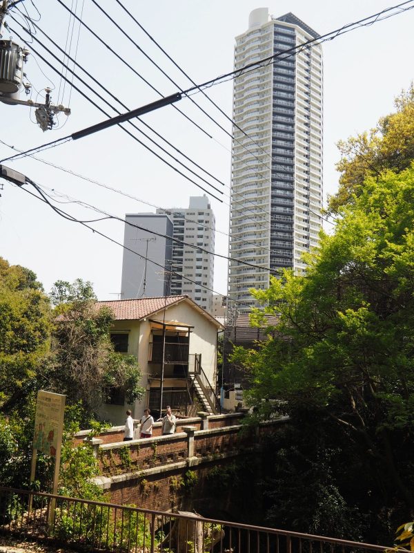 少し歩くと、明治30年ごろに架けられた国指定重要文化財である砂子橋が現れます。この橋は導水管を渡す水路橋で、現在も機能しているそうです。奥にはジークレフ新神戸タワーが建っており、以前からの風景が変わっていないことがわかります。