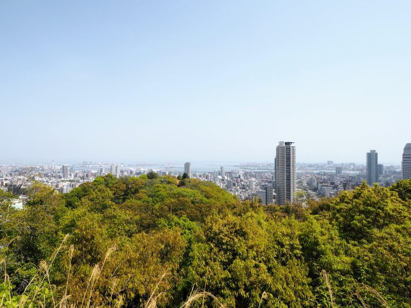 新神戸駅から布引の滝を目指して登山すると、みはらし展望台があります。ここからは、かつて生田神社が鎮座していた砂子山を見渡せます。生田神社は、延暦18年(799年)の大洪水で社殿が傾斜したため、現在地に移転しました。
