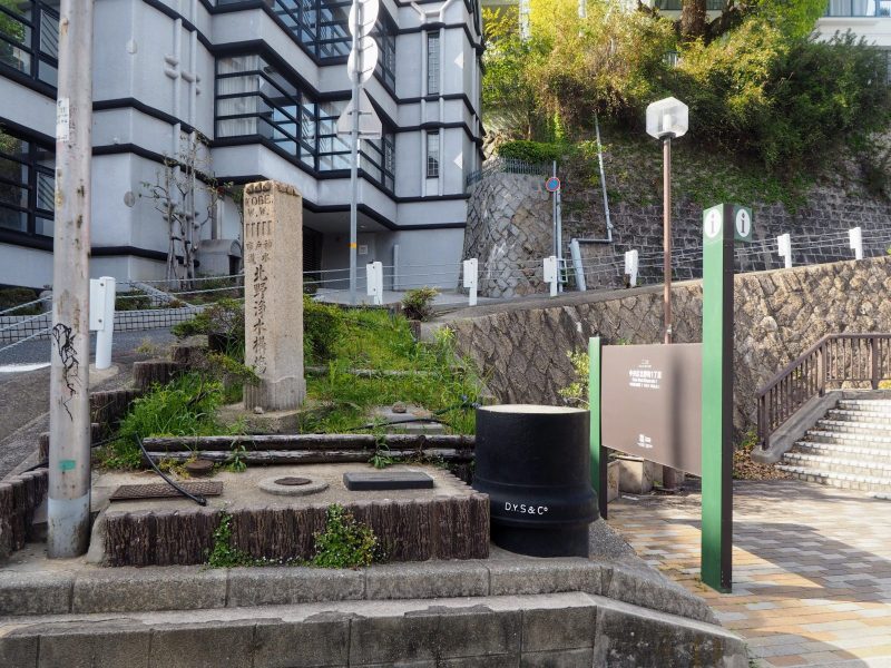 新神戸駅から北野通を西進すると、神戸市水道北野浄水構場の碑があります。神戸では1900年に全国で7番目に水道水の供給が始まり、「布引ダム」から「奥平野浄水場」へ導水していました。2003年に統廃合され、現在は結婚式場になっています。