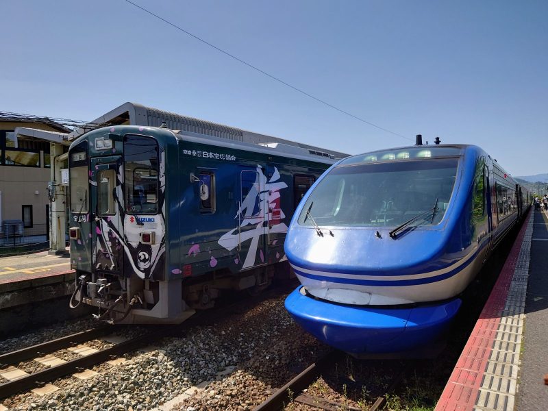入線していたWT3300形は、スズキのスポーツカー「ハヤブサ」をモチーフにしたラッピングが施されていました。実はある駅(隼駅)がバイク愛好家の聖地になっているため、その名にちなんでラッピングされたそうです。