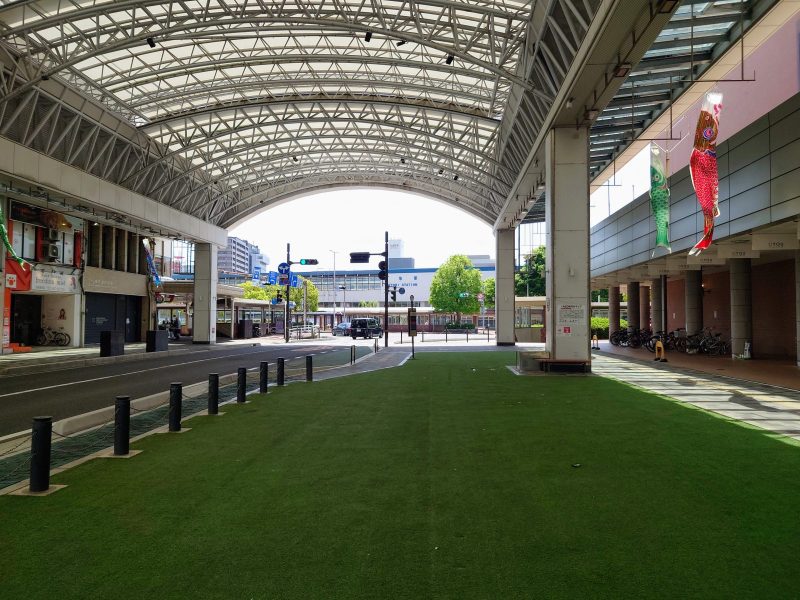駅前には道路空間を転用した芝生広場と、開閉式の大屋根「バード・ハット」があります。以前から何度か訪れたことがある鳥取駅ですが、このスポットは初めて見つけました。平成25年(2013年)に設置されています。