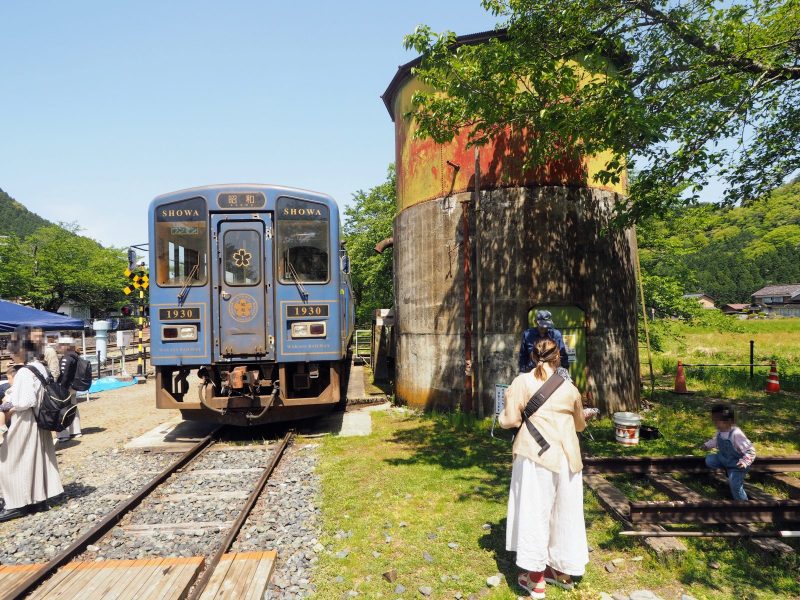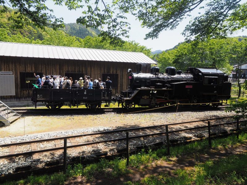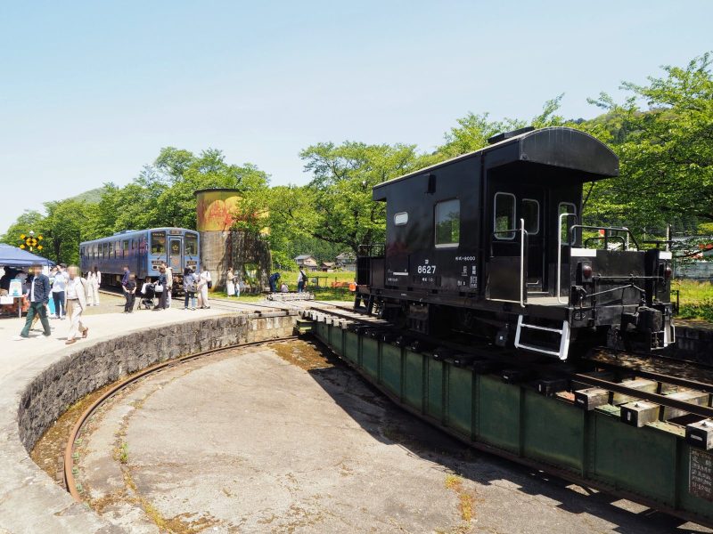 終点の若桜駅は、1930年に国鉄若桜線の終着駅として開業した歴史ある駅です。駅構内には手動の転車台や給水塔が保存されており、訪れた日はSL(蒸気機関車)C12型が牽引する貨車の乗車体験が行われていました。