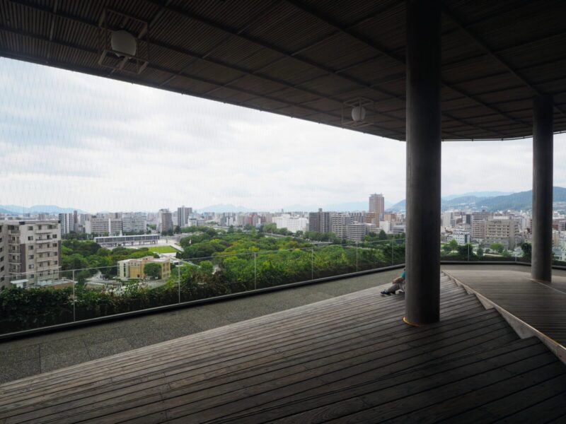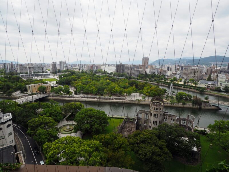 屋上には「ひろしまの丘」と呼ばれる展望台があり、原爆ドームや平和記念公園を一望できます。窓ガラスではなく、メッシュのワイヤーで囲まれているので、開放的な気分で風を感じながら景色を楽しめます。