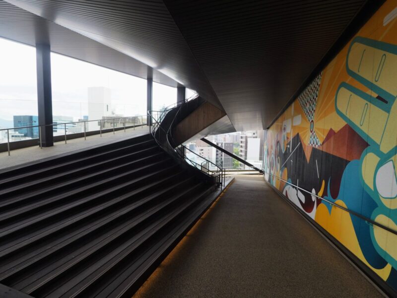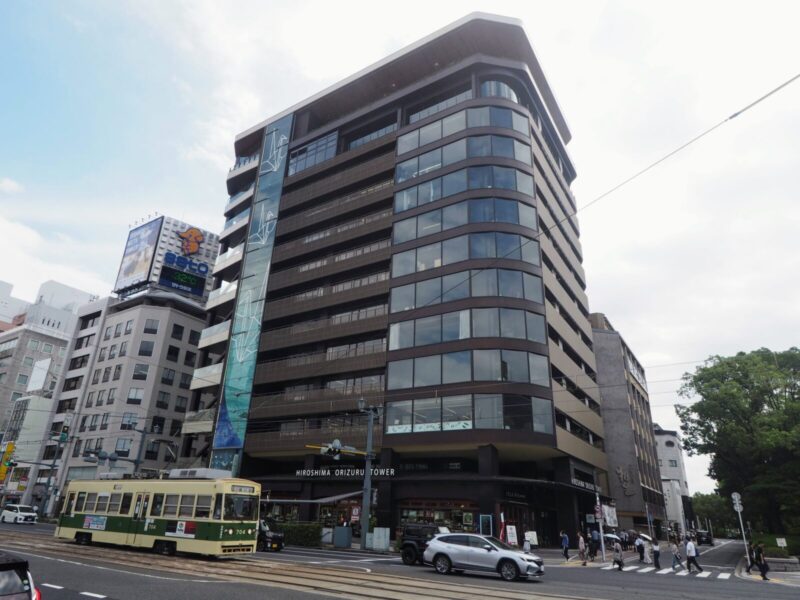 続いては、2016年に開業したおりづるタワーへ。元々は1978年に建てられたオフィスビルでしたが、自動車メーカーのマツダが取得し、大規模な改修を経て生まれ変わりました。設計は三分一博志建築設計事務所によるものです。
