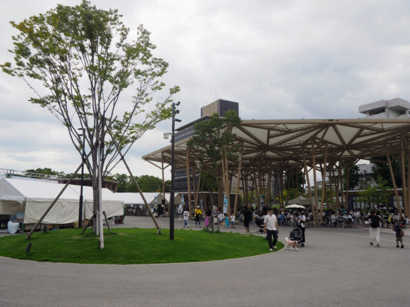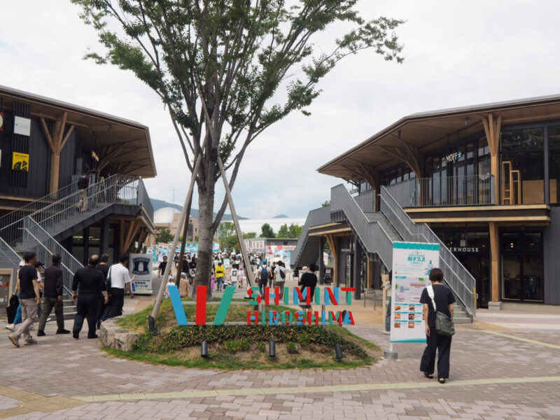 おりづるタワーの向かいには、2024年8月にオープンした「ひろしまスタジアムパーク」(通称:ヒロパ)があります。これは、2024年に開業した商業施設「エディオンピースウイング広島」を囲む広場として整備された場所です。フードイベントが開催されており、多くの人で賑わっていました。