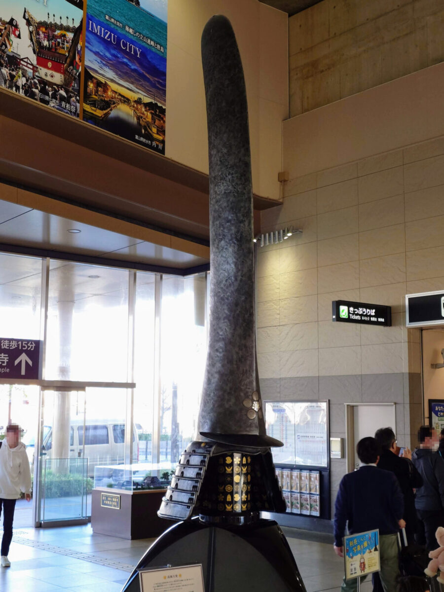 新高岡駅の改札前には、高岡開町の祖・加賀藩二代藩主、前田利長が愛用したと伝わる「銀鯰尾形兜」をモチーフにした巨大な兜が展示されています。高岡開町400年を記念して、地元の若手職人たちが高岡銅器・高岡漆器などの技を結集して制作したもので、高さ約4メートル・重さ約400キロの大きさがあります。