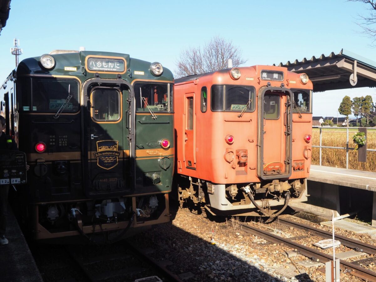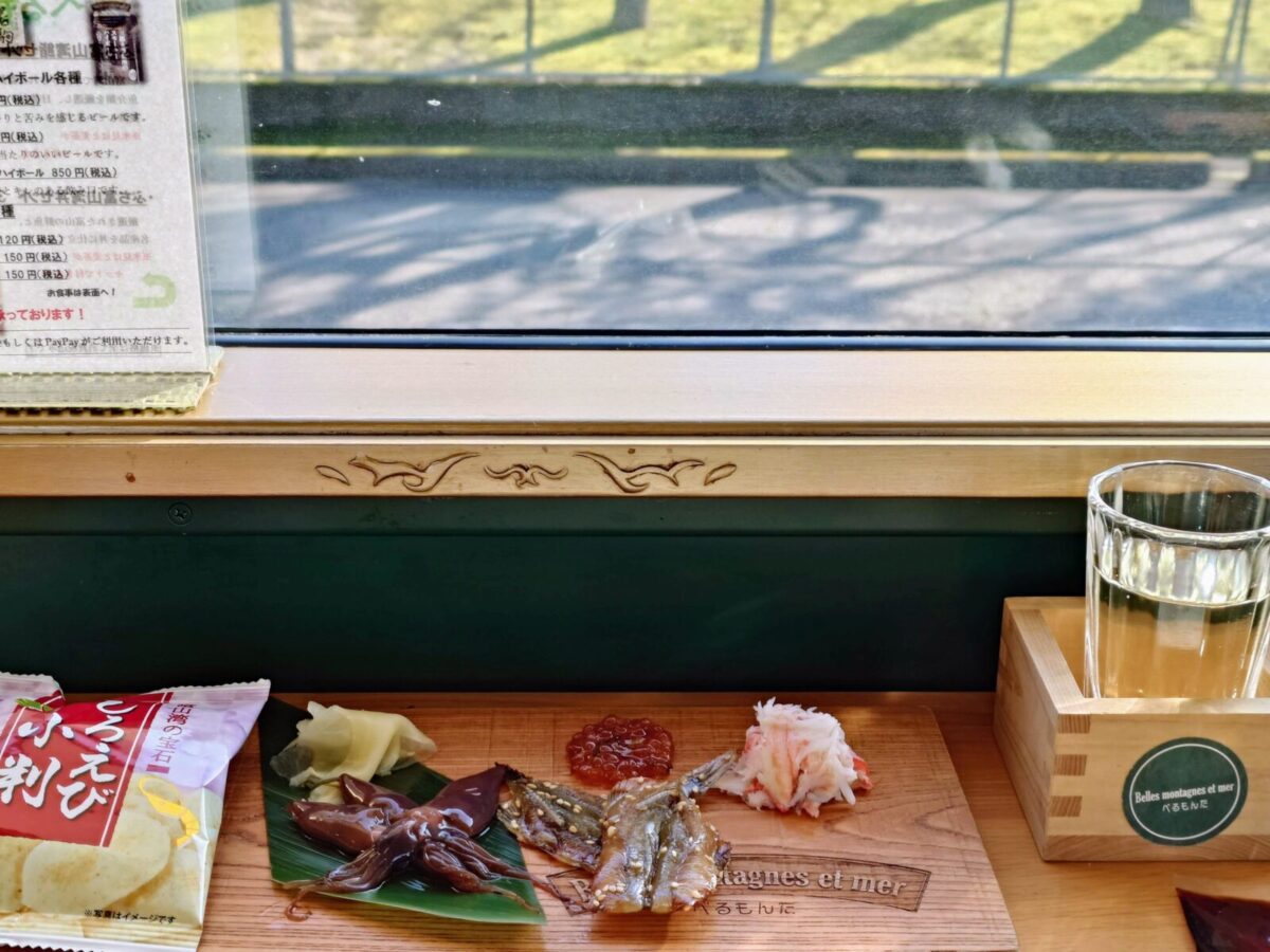 高岡と城端を結ぶ城端線は、田園風景の中をゆっくりと走るローカル線で、車窓からは立山連峰の山並みを望めます。今回は高岡駅まで観光列車「ベル・モンターニュ・エ・メール」(愛称「べるもんた」)に乗車し、地元食材を使った料理や日本酒を楽しみながら移動しました。