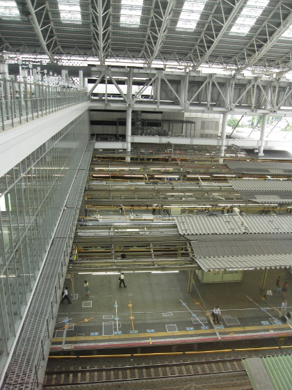 こちらも今問題になってるホームの屋根。大屋根が完成したことで、ホーム屋根が撤去されるって話だったんですが、ホーム屋根を撤去すると、雨が吹き込むという事実が判明して、再び設置されることにw透明の屋根にするらしいんですが、どうなるのか期待半分、不安半分です。
