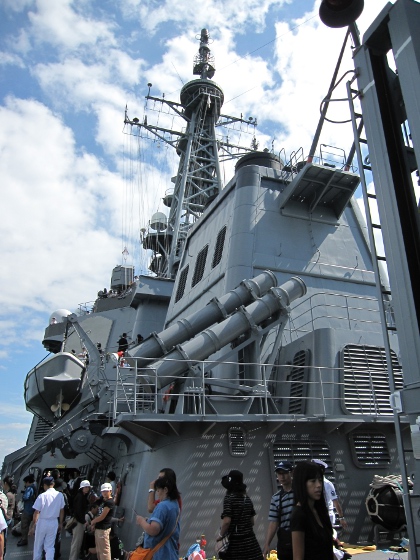 神戸港に入港した護衛艦「きりしま」に乗艦し、淡路沖まで往復してくるプログラムです。その他大阪や和歌山からも別の艦でも民間人を乗せて、出港しているので、計12隻の大イベントです。