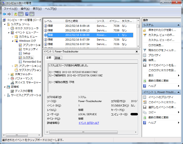 スリープから復帰したと考えられる時間をチェックすると・・・「スリープ解除の原因:不明」。はい、役立たずw