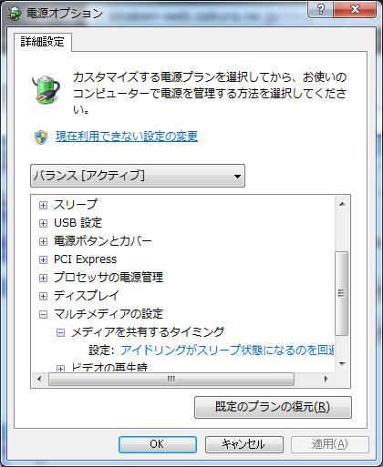 「コントロール パネル」-「システムとセキュリティ」-「電源オプション」-「プラン設定の編集」から「詳細な電源設定の変更」へ。
