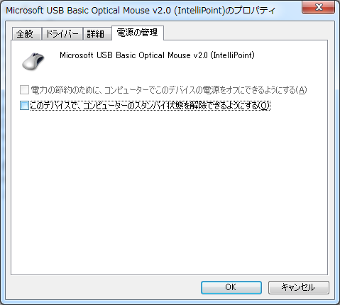 そして、スリープを復帰させそうなデバイスを片っ端から右クリック+プロパティで確認。「電源の管理」タブで「このデバイスで、コンピュータのスタンバイ状態を解除できるようにする」のチェックを外してみると・・・ビンゴ!