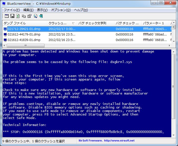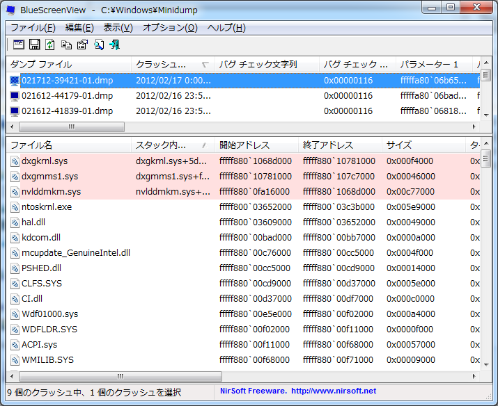 すると画面の下の方にどのファイルがクラッシュしたのかを赤字で表示してくれます。なるほど、「dxgkrnl.sys」「dxgmms1.sys」「nvlddmkm.sys」らしいです。名前からしてグラフィック関連かなーと思い、グラボとDirextXのドライバを最新にしたところ、無事に解消しました。ありがたい。