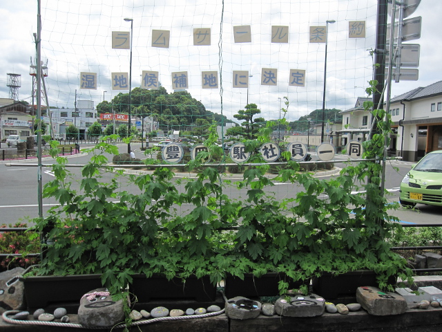 駅前にはラムサール条約の湿地候補に選定されたことをPRするモニュメントが。地味に縁石がご当地ゆるキャラ「玄さん」ですねー。