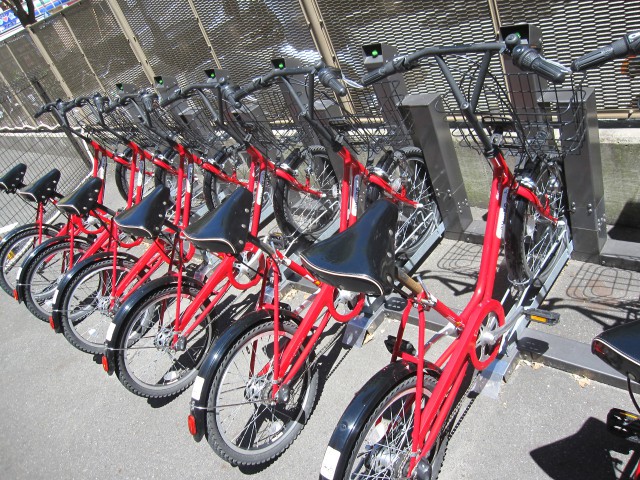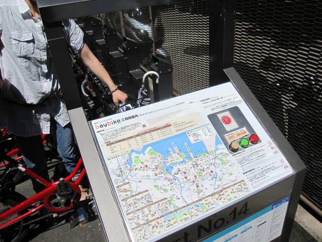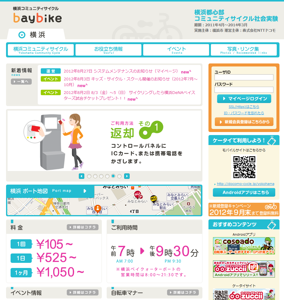 ここで今回利用したのが横浜コミュニティサイクル baybikeというサービスです。いわゆるレンタサイクルなんですが、docomoなどと協力してICTを活用したレンタサイクルなんですwあらかじめ登録したおサイフケータイを市内各所に配置された駐輪場の機械にかざすことで、自由に貸し出し・返却できます。通常のレンタサイクルのように1日中借りるのではなく、目的地に到着するとその都度返却するので、料金が低めに設定されています。回転率が高いんでしょうね。