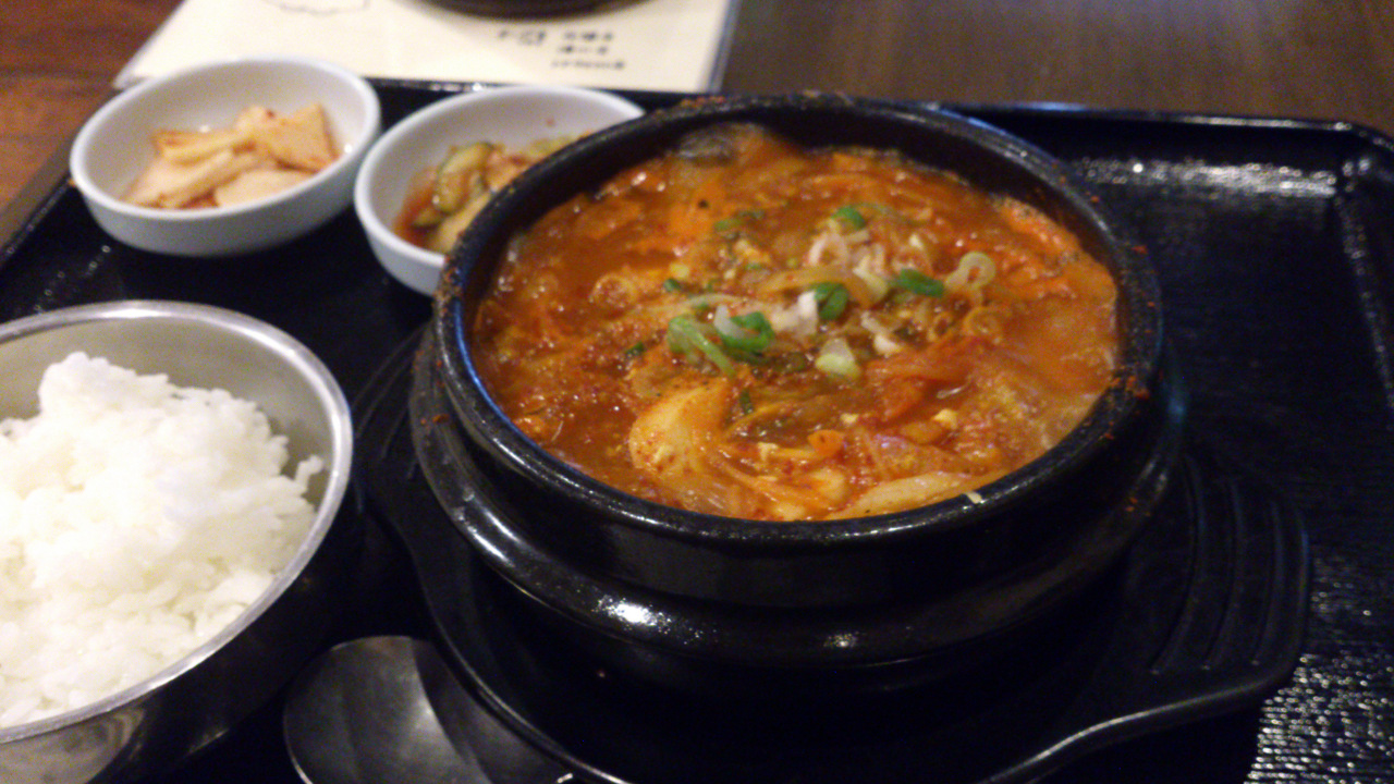 今回注文したのは、キムチスープ。昨日も書きましたが、辛いのが苦手なので、かなり辛かったwしかも気温もそこそこ高い中、ぐつぐつ煮えたぎる鍋。カプサイシン効果ですごく健康的になった気がしますw
