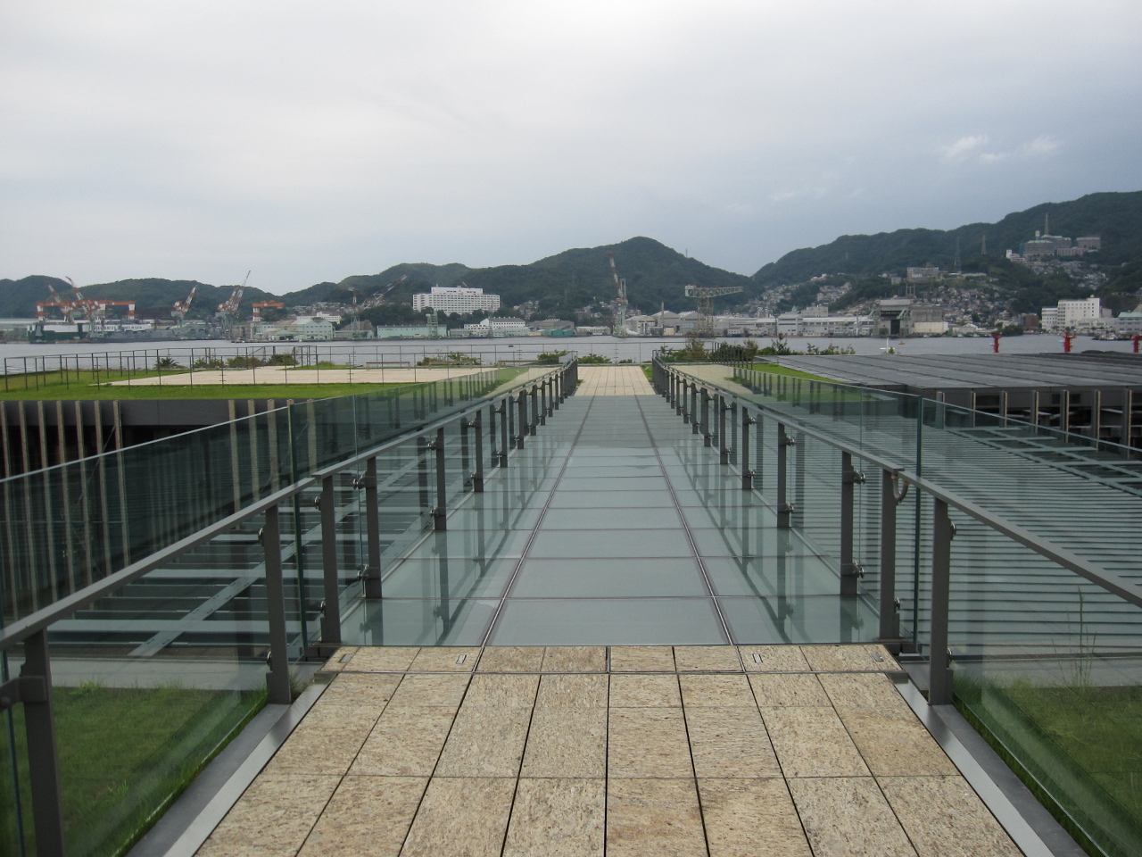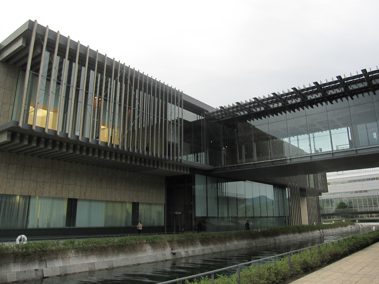 軍艦島から戻り、海岸線に沿って南に行くと長崎県美術館があります。隈研吾氏設計、2005年開館。運河を挟んだ二つの建物で構成されています。