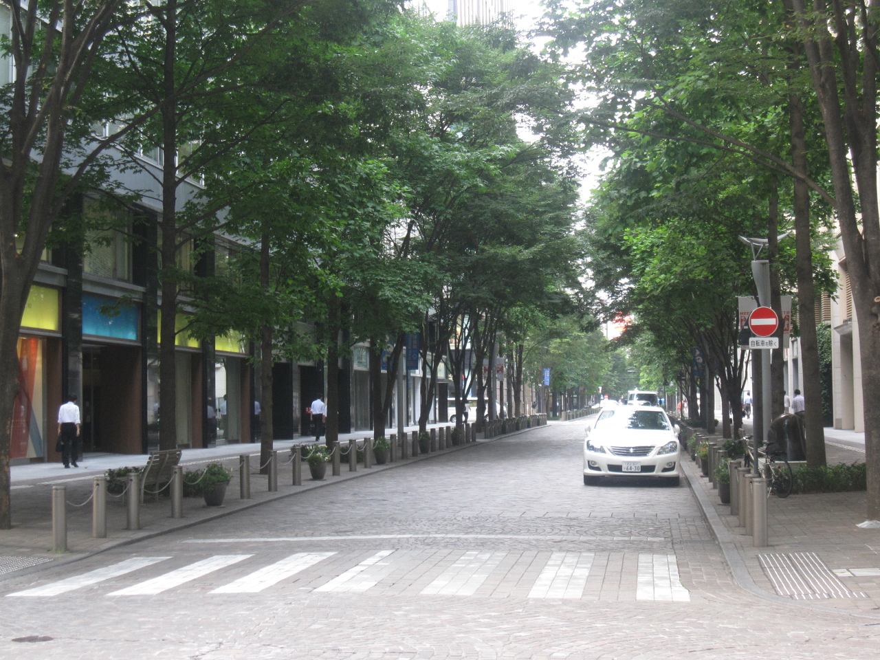 東京駅丸の内を歩くと、雰囲気のいい町並みが。舗装がピンコロ石で、金をかけてるなー、と驚きました。