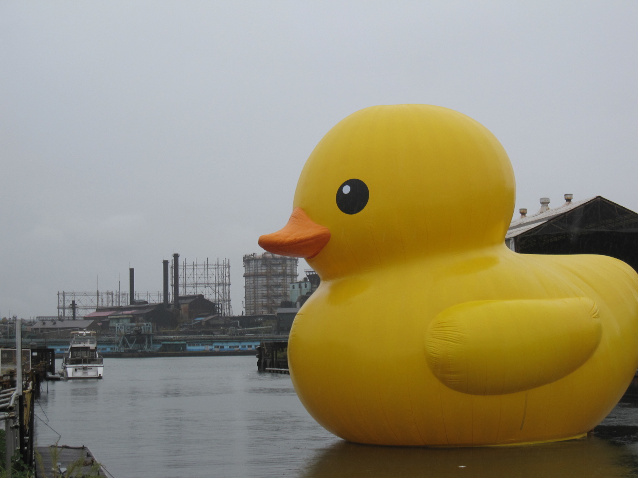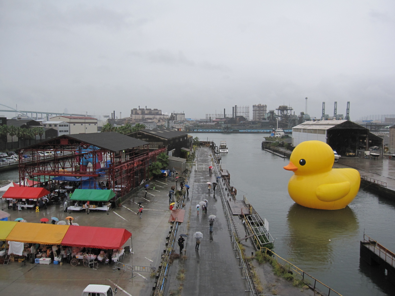 造船所を俯瞰して撮影。ラバーダックちゃんはドックにて鎮座されてます。あいにくの雨で、写真が暗いですorz 眼下のテントでは、ダンスパフォーマンスが行われたり、地元の方々による露店が出店していたりしています。
