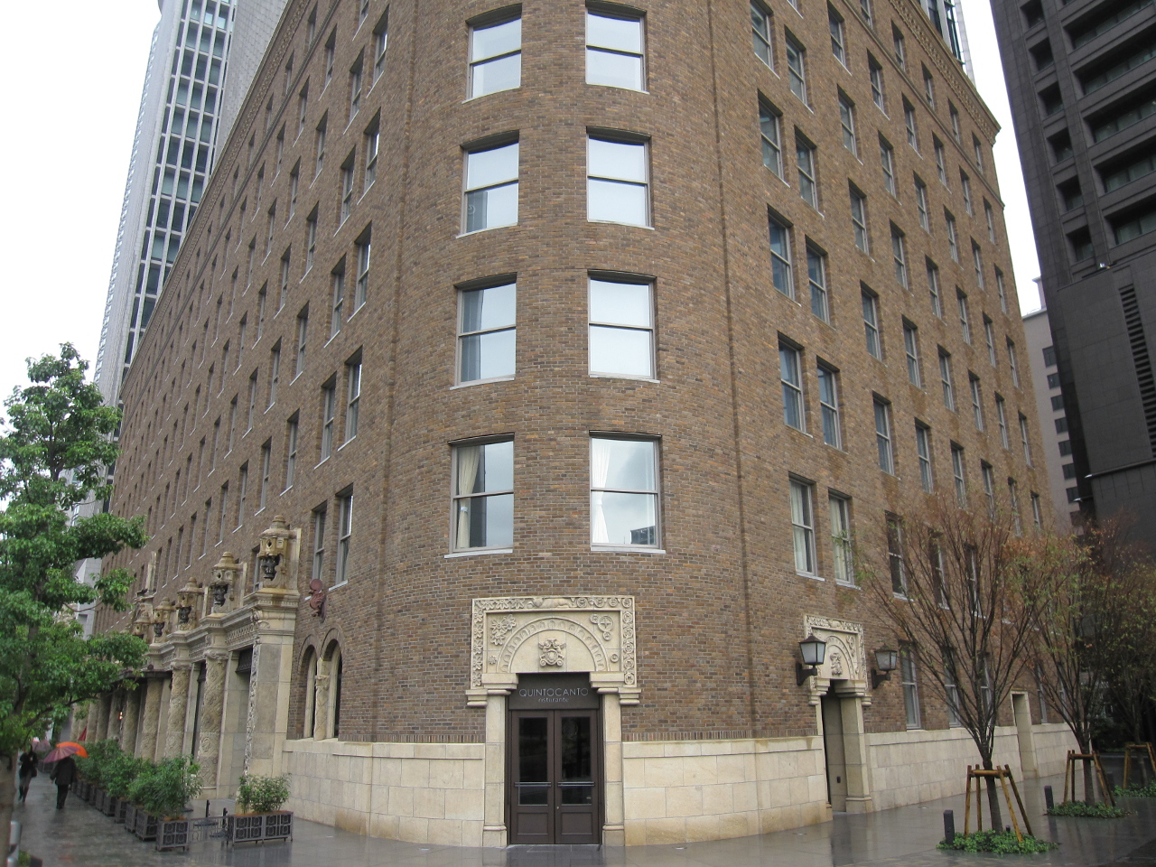 旧ダイビル本館は1926年、渡辺節設計(確か綿業会館の人だったかと)。これを低層部を保存しつつ、高層ビル化したのが現在のダイビル本館です。写真には入っていませんが、上には近代ビルが乗っています。