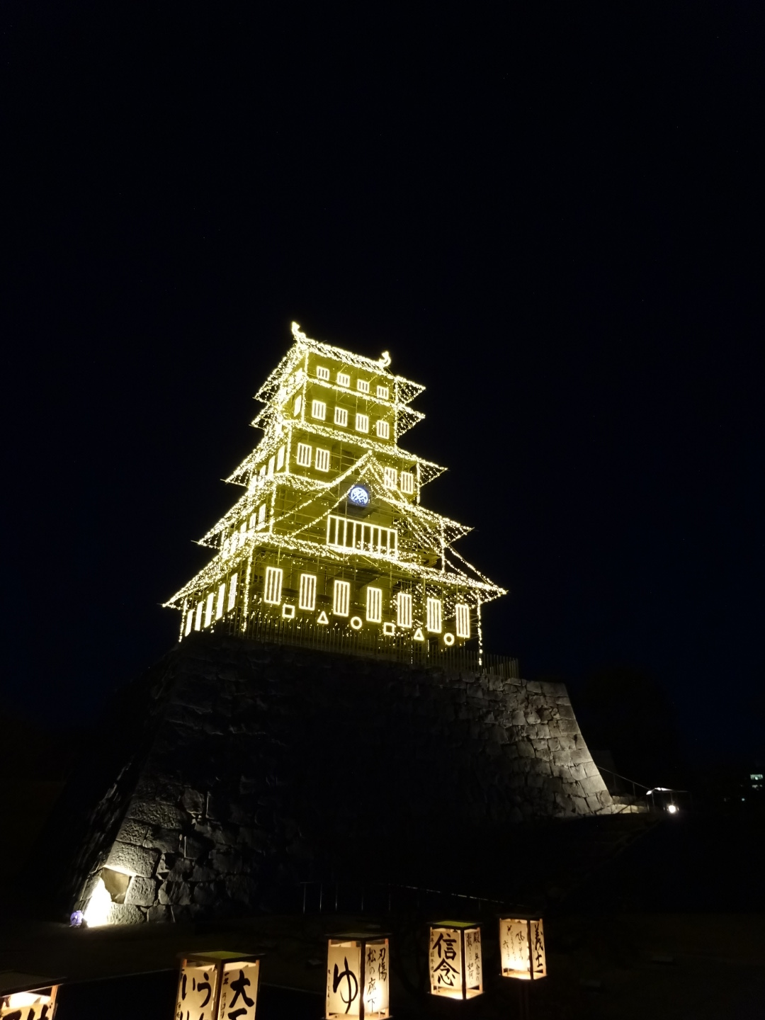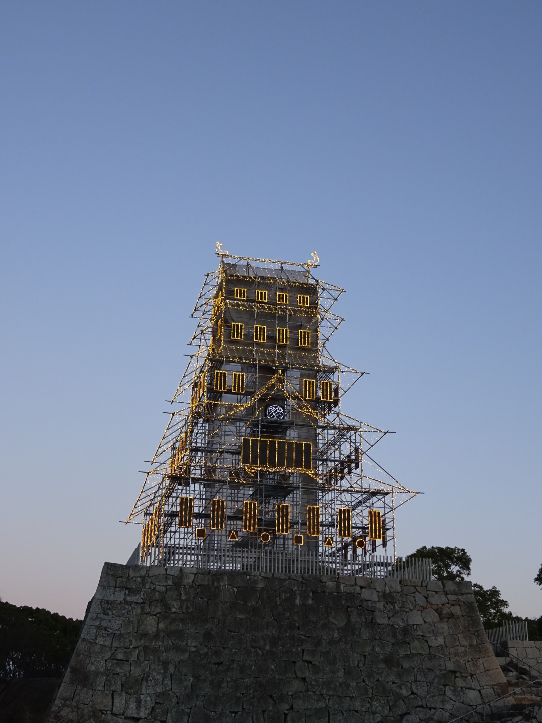 夜には赤穂城趾において、未成の天守がイルミネーションで再現されました。また現存する石垣を駆使して、流行のプロジェクションマッピングが行われていました。天守がないので、キャンパスが狭いですね・・・。いい写真が撮れなかったので、写真は割愛(ムービーはありますが)。